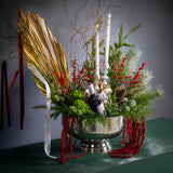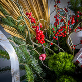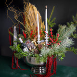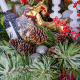 An ode to the grand holiday feast, our Réveillon Grandiose is the undisputed heart of any festive table. This breathtaking arrangement is a treasure trove of the season's finest, designed to delight every sense. A lush foundation of fresh, fragrant winter evergreens and frosted pine provides a bed for vibrant clusters of crimson Ilex berries, cascading red amaranthus, and gourmet holiday treats.
