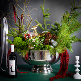 At its center, the warm glow of candlelight dances beside a celebratory bottle of fine red wine and a golden reindeer. Presented in a magnificent polished silver vessel, this is the ultimate statement piece for the discerning holiday host.