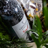Contents: A premium mix of fresh winter evergreens, Ilex berries, a bottle of Latourba Simil red wine, gourmet treats, two taper candles with holders, and other decorative elements.