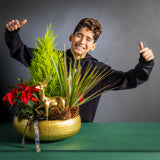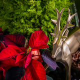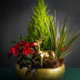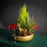 At the heart of this miniature forest, a magnificent golden reindeer stands proud, adding a touch of regal elegance. Presented in a beautiful hammered gold vessel, this arrangement is a show-stopping centerpiece and a thoughtful, lasting gift that will bring joy throughout the season.