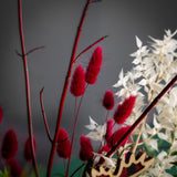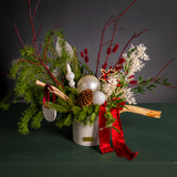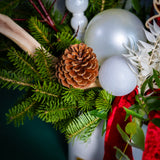 Our Noël au Chalet arrangement captures the warm, rustic spirit of a holiday retreat. This piece is a textural delight, featuring a lush base of fresh, fragrant winter pine, accented with natural pinecones, striking red branches, and soft, snowy white botanicals.