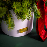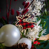The heart of this festive scene is a charming plaid moose ornament, bringing a touch of whimsical, cabin-chic style. Finished with pearlescent ornaments and a classic red velvet ribbon, this centerpiece is perfect for bringing a warm and inviting holiday atmosphere to any space.