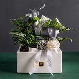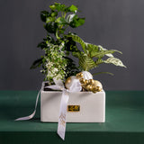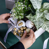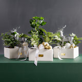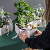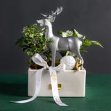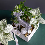 Our Winter Grove Collection is a uniquely thoughtful and sustainable way to share the holiday spirit. Each piece is a living arrangement, featuring a curated selection of vibrant houseplants like Zebra Plants, Nerve Plants, and English Ivy. For the holidays, we transform them into a whimsical winter scene with charming silver reindeer, glistening ornaments, and festive accents.
