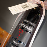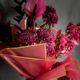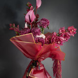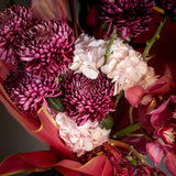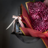 This exquisite hand-tied bouquet showcases a dramatic blend of deep burgundy chrysanthemums, striking magenta anthuriums, and cascading cymbidium orchids. The rich textures and colors are artfully arranged and presented in our signature deep red wrapping with elegant gold-edged details. Paired perfectly alongside is a bottle of exquisite Latour.ba Merlot, creating a harmonious and impressive duo for any connoisseur of fine things.