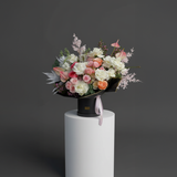 This luxurious arrangement features a premium, seasonal mix of the finest flowers, including lush garden roses, exotic anthuriums, and soft spray roses. The vibrant palette of coral, peach, blush pink, and creamy white creates a breathtaking contrast against the deep black of the vessel. Complemented by delicate, trendy ferns and other textural elements, this piece is pure artistry.