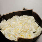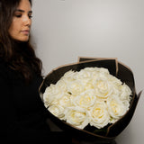 How literally sweet is this? A dozen pristine white roses, elegantly arranged to symbolize purity, respect, and timeless love. Now imagine making this classic gift even more special—by customizing it with your loved one’s name on our exclusive Signature Cone, available in black or silver.