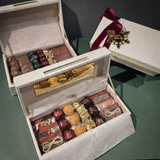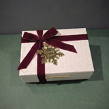Our Coffret Signature is the ultimate expression of thoughtful holiday gifting, designed to be treasured for years to come. The experience begins with an exquisite white keepsake box, featuring a beautiful woven texture, rich burgundy velvet ribbon, and a personalized golden snowflake tag engraved with your family name.