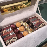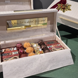 Upon opening, the magic continues. The lid reveals a gleaming gold plaque, custom-engraved with the heartfelt message, "Where love is shared, life is sweet," and your family's name. Below lies a curated assortment of our finest gourmet holiday chocolates.