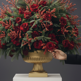 This opulent arrangement features a premium selection of the season’s richest blooms, including velvety deep red roses, striking crimson Ilex berries, and lush, fragrant winter greens. The dramatic palette of deep rouge and bright crimson creates a breathtaking contrast against the burnished gold of the vessel. Complemented by noble fir and pine textures, this piece is pure holiday artistry.